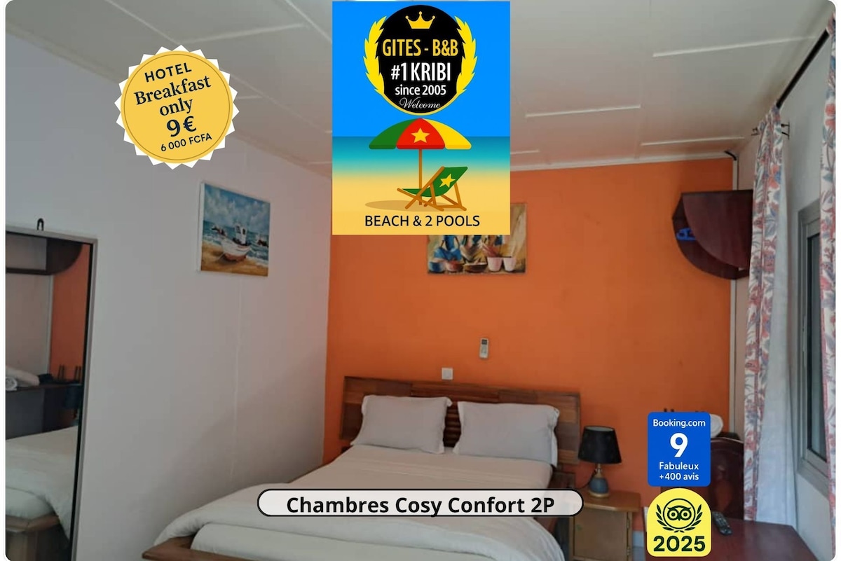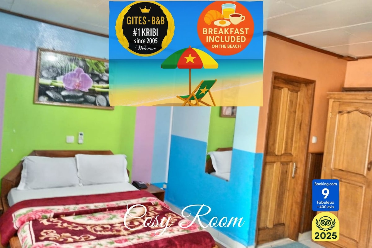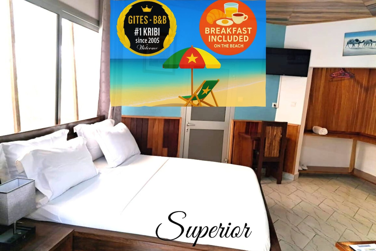 Petits Déjeuners a volonté Inclus - Chambre cosy et confortable au sein des Gîtes de Kribi, idéale pour une escale à petit budget tout en profitant des services d’un véritable hôtel : 2 piscines, plage à quelques pas, wifi, parking, sécurité 24h/24 et jacuzzi. Vous bénéficiez aussi de 10 % de remise sur tous vos repas au restaurant Au Plaisir du Goût. À quelques minutes des chutes de la Lobé et du centre-ville de Kribi. Ambiance tropicale et personnel chaleureux.