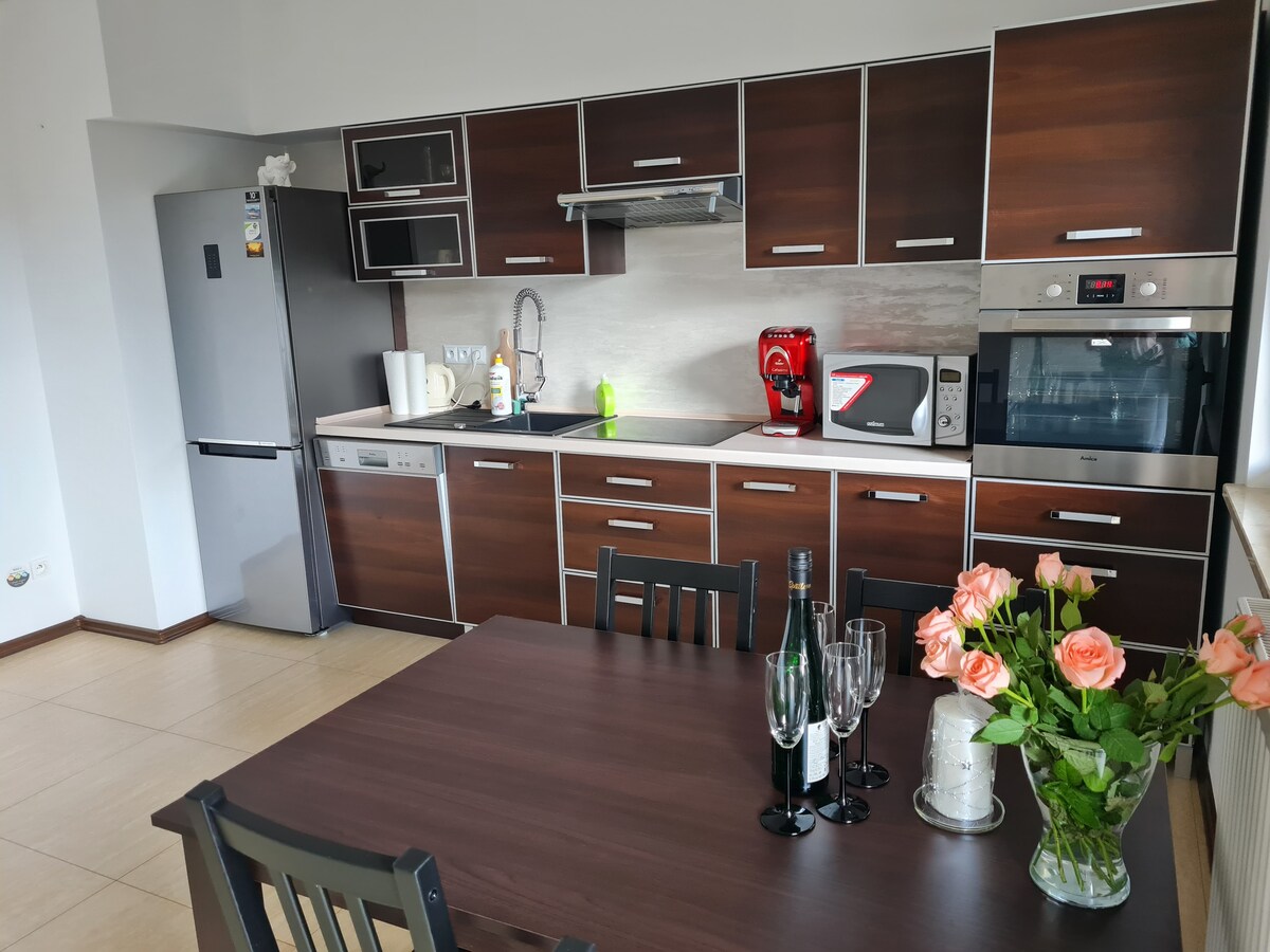 Cet appartement moderne et meublé est situé dans un complexe sécurisé au cœur de la ville de Lodz. Séjour spacieux avec canapé confortable, table et 4 chaises, meuble TV et TV 55" avec Play Station pour des jeux comme sur la photo et avec des applications comme Netflix, Apple TV, Max, Prime est connecté à une cuisine entièrement équipée. Chambre principale avec lit queen size. Chambre d'amis - lit double. Une place de parking est dédiée pour vous, à l'intérieur de la zone sécurisée, à côté de l'immeuble.