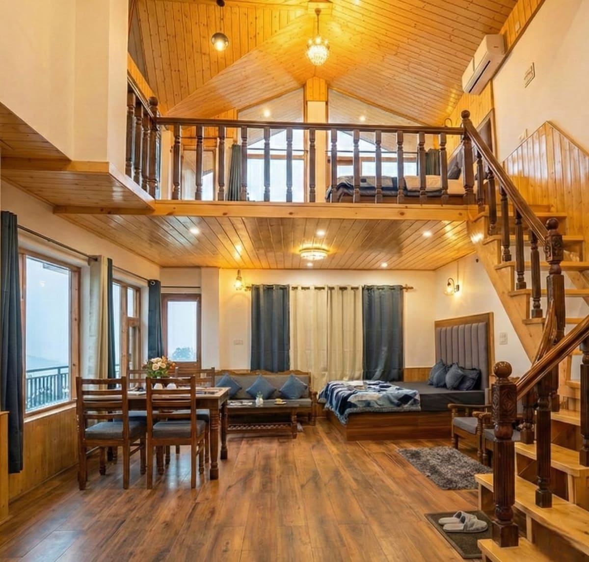 Évadez-vous dans un duplex confortable à flanc de colline à Kullu, niché dans un endroit paisible mais pittoresque surplombant la vallée de la rivière Beas, qui est à seulement 10 minutes de Bhuntar, 15 minutes de Dhalpur, 1 heure de Kasol et 1,5 heure de Manali. Le duplex de luxe dispose d'intérieurs en bois, d'un jacuzzi, d'une PS4, d'une cheminée, d'un balcon et d'une cuisine complète, ce qui le rend idéal pour les familles, les couples ou les amis à la recherche d'une vue sur la montagne, d'une ambiance calme et d'un accès facile au meilleur de la vallée de Kullu.