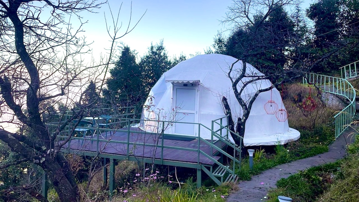 Unidome w/ Private Jacuzzi & Himalayan View – Soul Stroll Cottages Escape to Unidome, a luxurious dome with panoramic windows at Soul Stroll Cottages, offering a pvt indoor Jacuzzi and breathtaking Himalayan views. It is setup with cozy interiors & plush bedding. This unique stay blends modern comfort with nature’s serenity. Wake up to unmatched sunrise views, soak under the sun with a stunning mountain backdrop, enjoy dreamy nights around a crackling fire & explore hidden trails and waterfalls