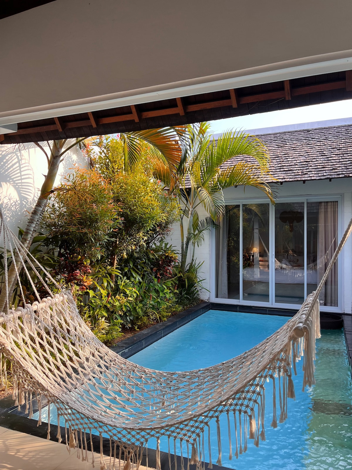 Villa design d'une chambre entourée par la nature à Ungasan : • Fenêtres du sol au plafond s'ouvrant sur un jardin privé • Chambre aux tons terre avec détails architecturaux • Salle de bain inspirée du spa avec douche • Piscine turquoise privée • Salon extérieur couvert avec lampes suspendues • Cuisine et salle à manger entièrement équipées. • Wifi 300 Mbit/s • Service de ménage quotidien ; • Netflix, PS5 et équipements pour bébé sur demande • Concierge pour les transferts, la location de scooters et les activités sur l'île • Animaux acceptés • Dépôt remboursable de 500 000 IDR