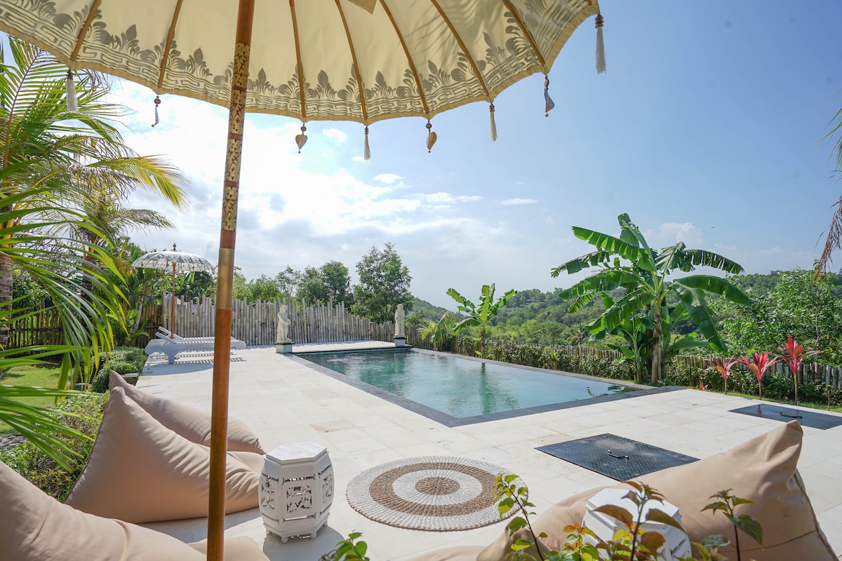 Maison en bambou écologique à Sidemen : piscine et jardin