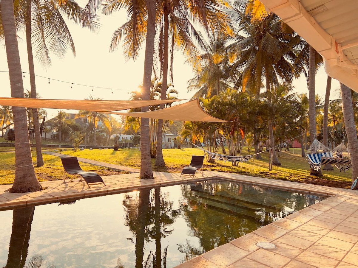 Maison de plage face à la mer, entièrement privée. La maison dispose d'eau douce, une citerne a été faite à cet effet, et la piscine est d'eau salée. Cuisine entièrement équipée avec A/C. Deux chambres avec A/C et salle de bain privée chacune. Rancho de repos avec hamacs, sortie piétonne à la plage, idéal pour se reposer, accompagné d'amis et de la famille, Calme et confortable. Conçu pour l'intimité de nos clients. 3 parkings privés à l'intérieur de la propriété.