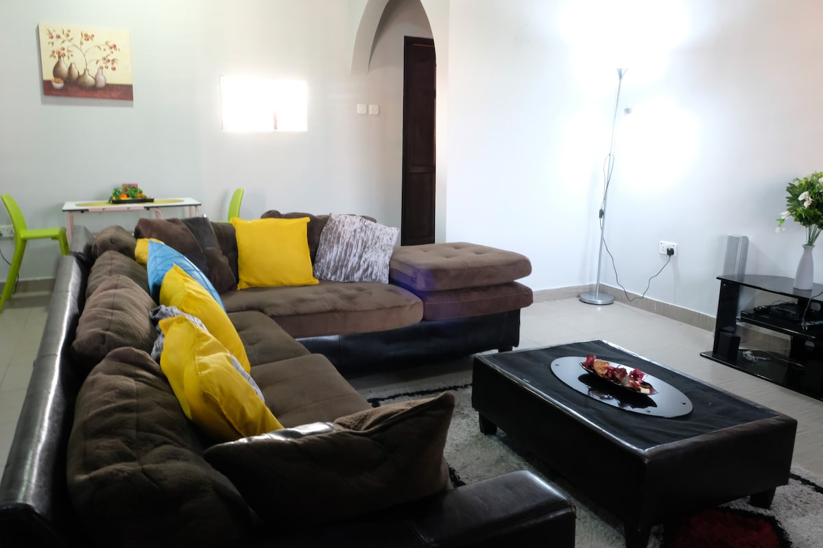 Bienvenue dans votre maison d'invité privée d'une chambre à Cantonments, l'un des quartiers les plus sûrs et les plus recherchés d'Accra. Cette retraite moderne offre une chambre lumineuse avec un lit queen, un salon confortable avec une télévision intelligente, une salle de bain élégante avec de l'eau chaude et une cuisinette entièrement équipée. Avec la climatisation, le Wi-Fi haute vitesse fiable et la sécurité 24 h/24 et 7 j/7, vous profiterez à la fois du confort et de la tranquillité d'esprit. À quelques minutes des ambassades, des restaurants, des centres commerciaux et de l'aéroport de Kotoka.