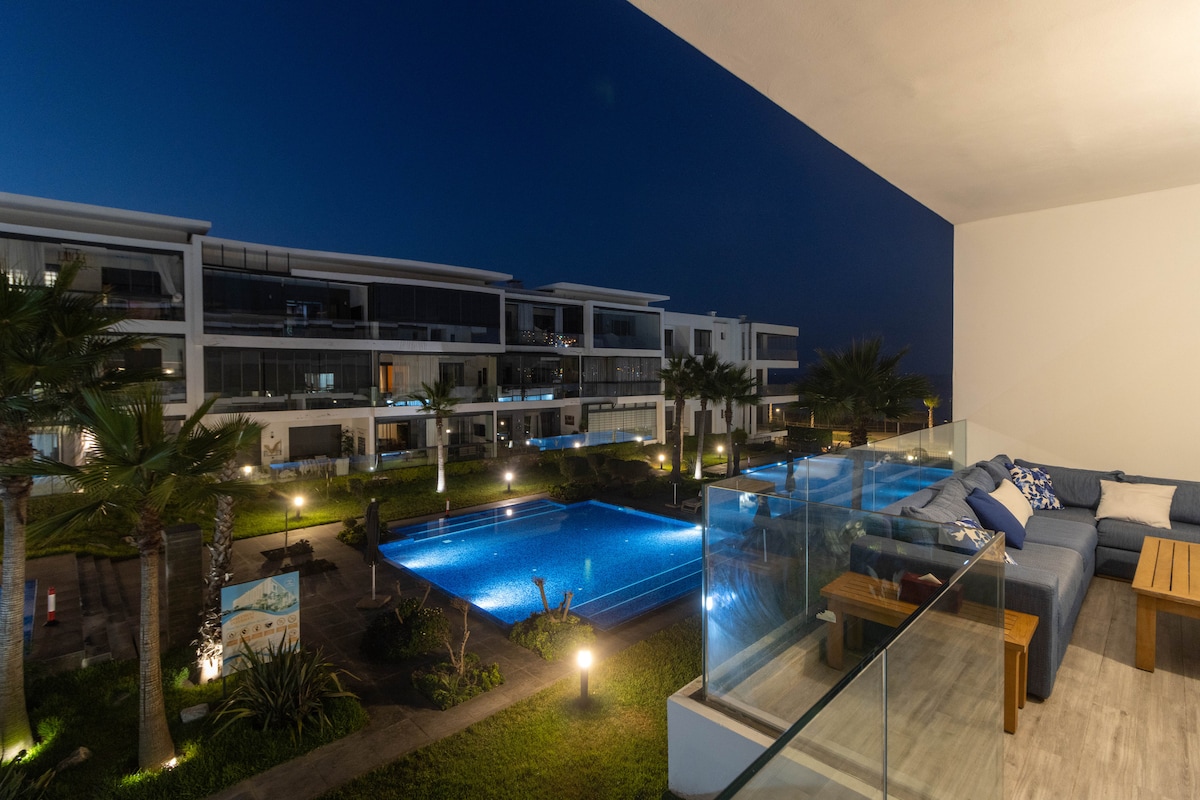 Appartement front de mer situé dans une résidence sécurisée 24h/24 7j/7 avec parking gratuit au sous-sol disposant d'une grande terrasse offrant une vue imprenable sur l'océan , ascenseur et grande piscine à 20 minutes en voiture de la corniche de Casablanca. La résidence est proche de toutes les commodités, restaurants, supermarchés, écoles de surf... L'un des meilleurs endroits à Casablanca pour passer un séjour dans le confort, le calme et la sécurité.