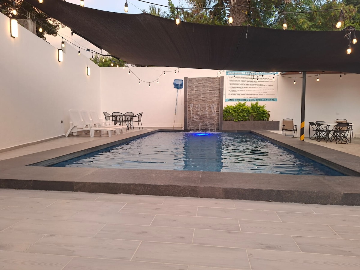 Profitez de ce nouvel appartement central avec piscine, en privé, entouré de toutes sortes de commerces, tels que des restaurants, des cafés, OXXO et la cathédrale de la ville à quelques mètres. Il dispose d'un grand parking, d'un lit King size, du wifi, de la climatisation, d'une télévision, d'un minibar, d'une table et de tout ce dont vous avez besoin pour un séjour agréable. La zone est sécurisée et dispose d'un portail électrique. En plus des caméras de sécurité à l'extérieur, pour une plus grande tranquillité d'esprit des clients.