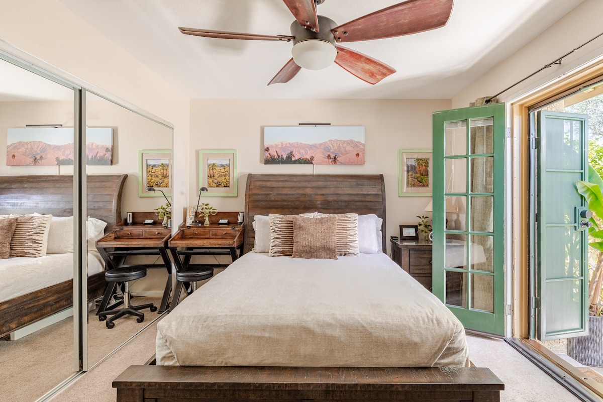 Ville de Cathedral City Permis STVR n° 015862. Refuge privé confortable, propre et isolé avec entrée séparée, chambre et salle de bain. Situé dans le quartier charmant et sûr de Caliente Sands. Lit Queen Size, TV avec films Roku gratuits, table, bureau, WIFI, ventilateur de plafond, mini-réfrigérateur/congélateur, micro-ondes, tours USB, machine à café Keurig et sièges extérieurs dans votre cour privée avec fontaine murale. Parking à proximité de votre entrée. Palm Springs à proximité, à proximité du centre-ville de P.S. et de l'aéroport. LGBTQ+ toujours les bienvenus.