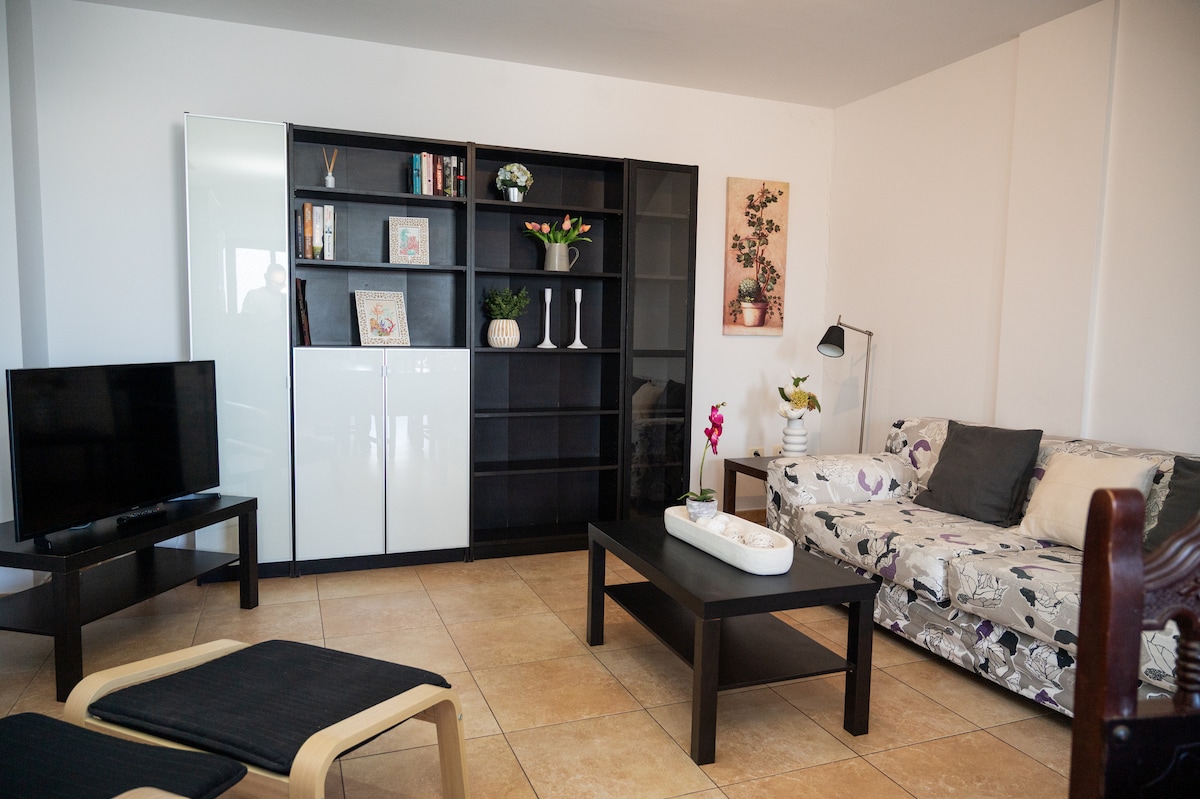 Appartement Salitre La Caleta El Hierro, Canaries. Zone côtière très calme, salon, Smart TV 55', cuisine avec appareils électroménagers, Wifi, lave-linge, chambre avec lit double, canapé-lit dans le salon pour deux personnes, grandes armoires, lit bébé et chaise haute, salle de bain complète avec douche, terrasse avec 2 chaises longues, table, chaises d'extérieur avec vue sur la mer, piscines naturelles d'eau de mer à 100 m, 2 min. de l'aéroport et 5 du port. Valverde la capitale à 10' de La Caleta, Parking à la porte.