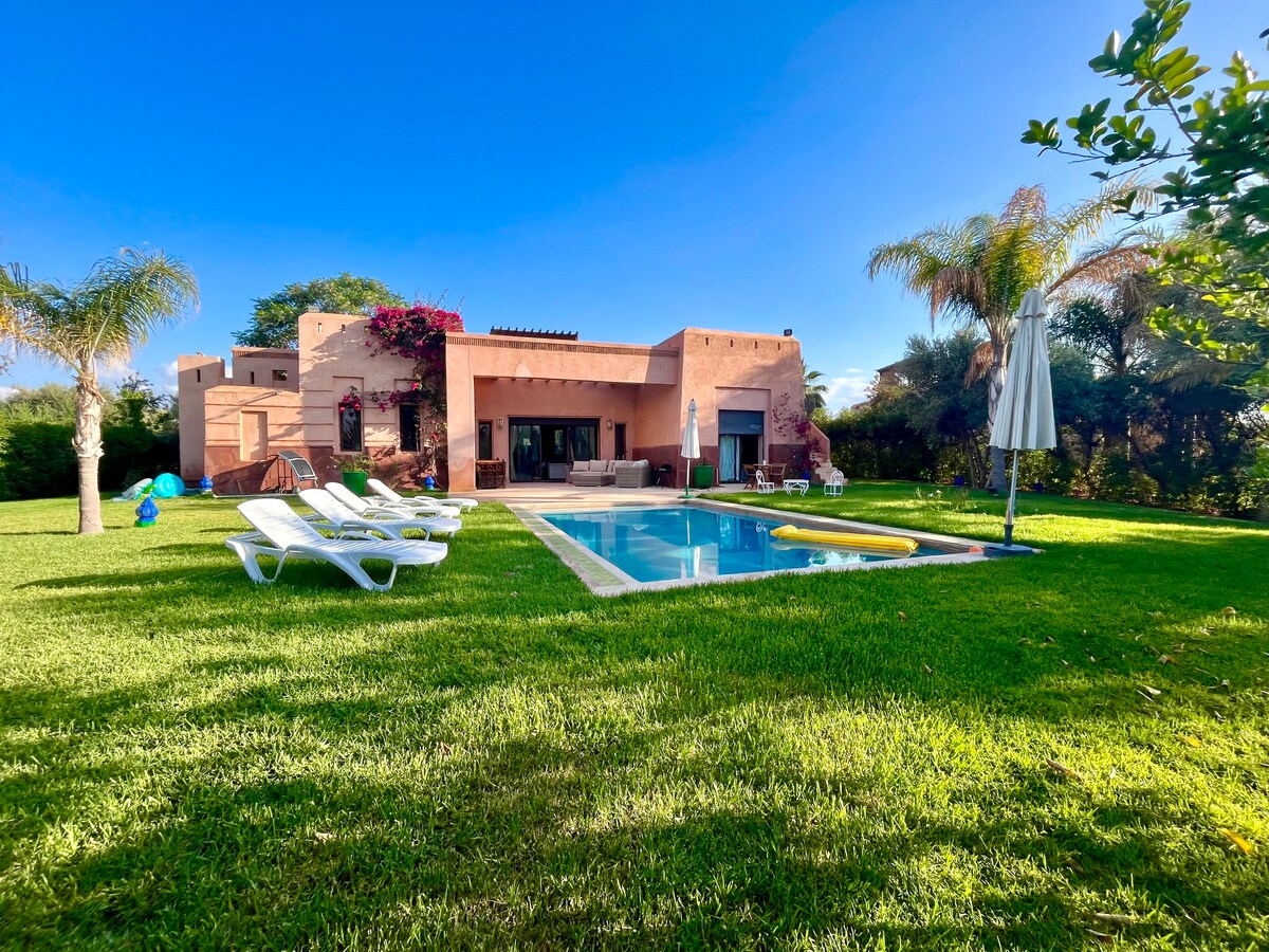 Grande maison avec Piscine, pour se retrouver en famille ou entre amis, jusqu’à 13 personnes. En toute tranquillité. Gardiens sur place à votre disposition . Il y a 5 chambres et 4 salles de bain , une cuisine , un grand espace salon intérieur avec une grande cheminée et un grand espace repas l hiver . Espace repas également dans le jardin l été . Une grande terrasse panoramique d où l on peut voir la chaîne de l atlas et le coucher de soleil .