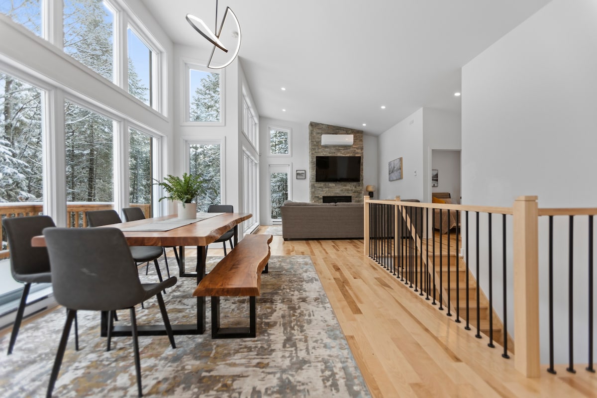 Profitez de l'effet apaisant de la nature en séjournant dans ce chalet contemporain à fenestration abondante en plein coeur de la forêt. Tremblant est magnifique, peu importe la saison. Destination plein air de rêve, vous serez à 8 minutes du Mont-Blanc et 20 minutes du Mont Tremblant. Que ce soit pour la randonnée, le ski de fonds, la raquette ou la motoneige, des sentiers sont accessibles facilement dans toutes les directions. Sans oublier le célèbre P'tit Train du Nord à 3 minutes de route.