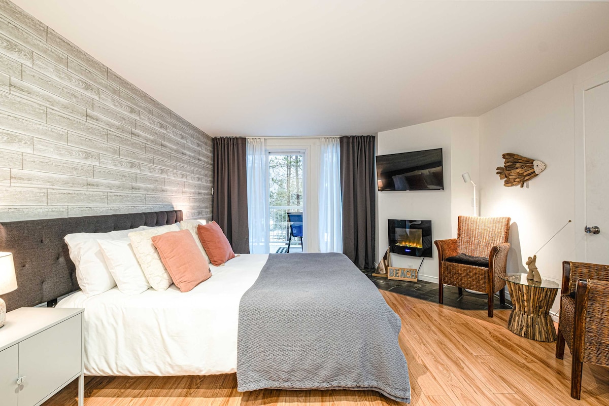 Meilleur rapport qualité-prix ㋛ *À proximité de la station de montagne * Situé dans le vieux village Studio moderne entier meublé avec goût, cuisine complète avec appareils électroménagers neufs, grand balcon privé, parking. Air climatisé portable Wi-Fi haut débit et illimité + TV 4K À 10 minutes en voiture de : •Station du village de Tremblant pour le ski, la randonnée, leshopping,le vélo, restaurants,Casino,Spa. •À distance de marche :parcs, pistes cyclables, lacs, boutiques, restaurants, café, (piscine/jacuzzi partagé en été/automne) Réservez pour profiter pleinement Mont-Tremblant, ㋛