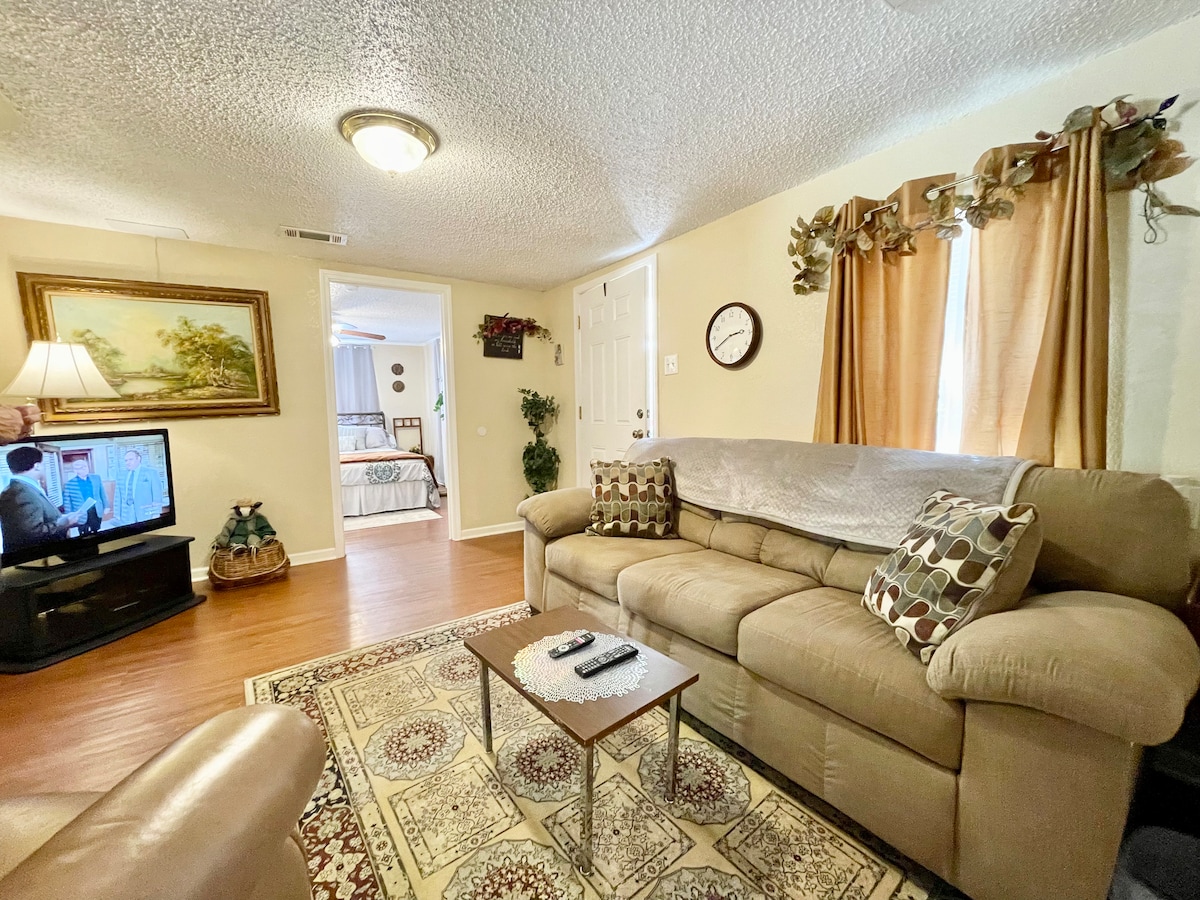 Cette suite d'une chambre super propre est spacieuse et calme. Entrez dans votre salon relaxant meublé avec des meubles confortables. Une kitchenette entièrement approvisionnée avec un réfrigérateur de grande taille, un four à grille, une station de café et de thé. La suite fait partie d'une maison plus grande qui est complètement isolée avec des entrées privées. La maison est nichée dans les grands pacaniers avec une balançoire de grande taille. Vous pourrez également profiter de la terrasse juste devant votre porte.