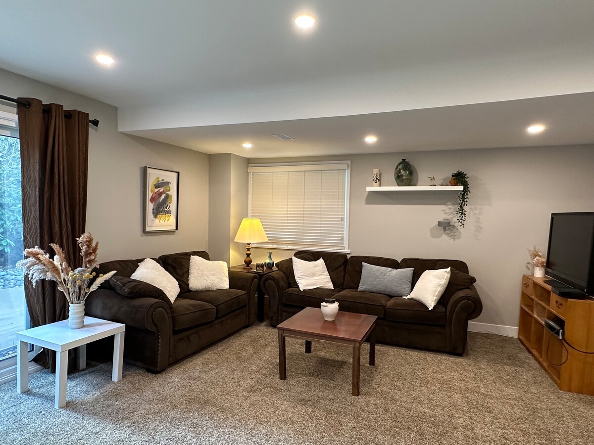 Une suite confortable au sous-sol offre une cuisine complète, une salle à manger et un salon spacieux, une salle de bain rétro-moderne. Dormez bien dans un lit queen avec des draps blancs et des oreillers célestes. Profitez d'une connexion Wi-Fi gratuite et regardez vos films Netflix préférés dans une immense télévision avec une cheminée électrique chaude. Le café du matin et les bouteilles d'eau sont gratuits ! Situé dans un quartier calme où vous pouvez marcher sur les sentiers à proximité. À 20 minutes en voiture du/vers le terminal de ferry de Tsawwassen. À 30 minutes en voiture de/vers l'aéroport YVR.