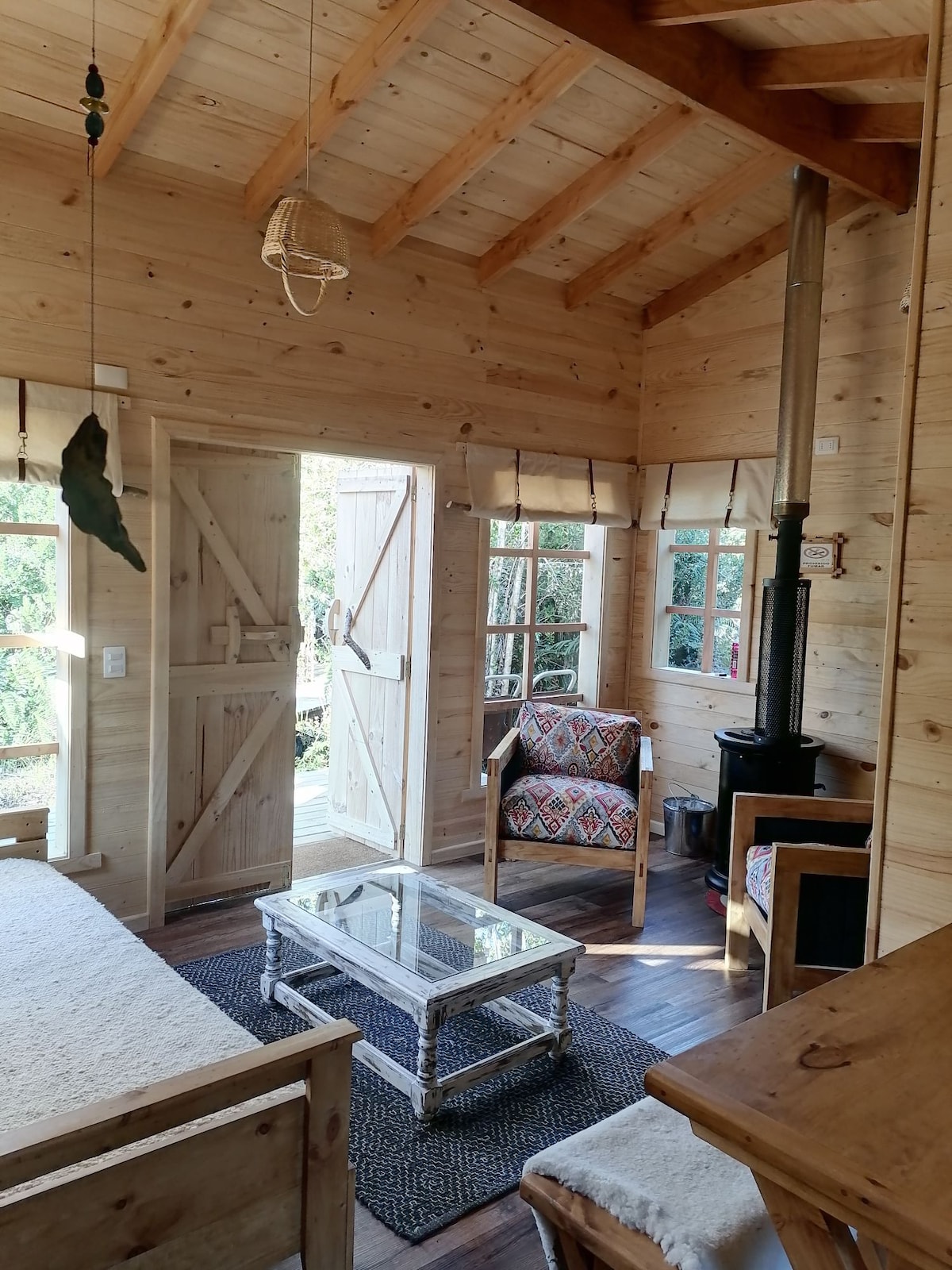 belle cabane située au bord de la rivière, avec descente incluse où vous pourrez vous détendre en écoutant le bruit de l'eau, en plus de mentionner que la cabane est complètement neuve et entièrement équipée