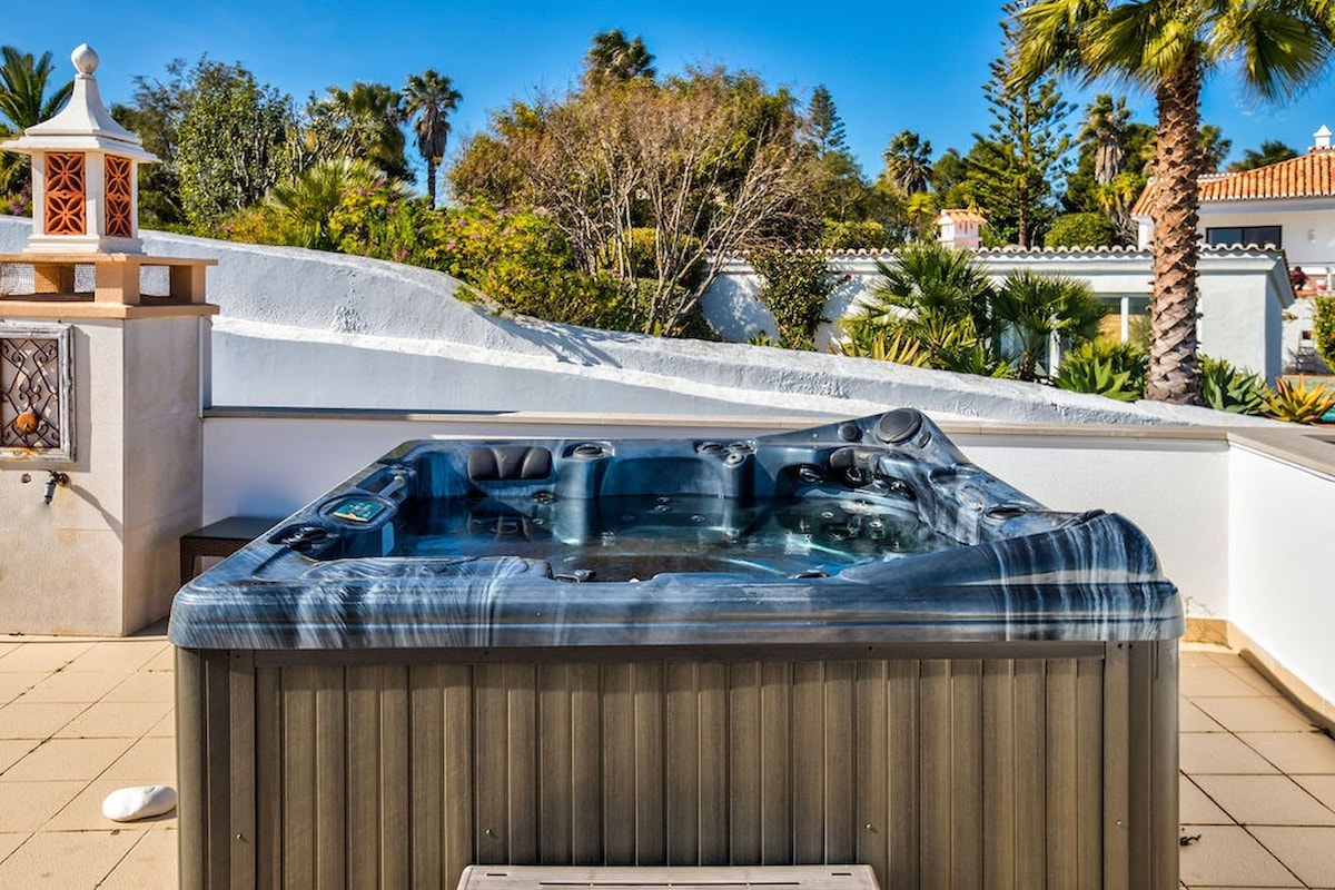 Patio privé sur le toit avec jacuzzi, barbecue et vue