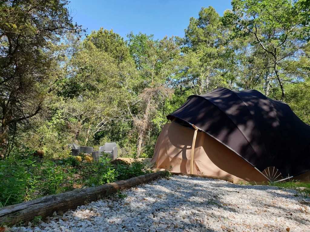 MICA, tente équipée tout confort 12 m² pur coton, rivière à 5 min à pied. Un lieu hors du temps. Sur le même lieu LA COLLINE VAGABONDE : 1 autre tente, une cabane sur pilotis, 1 maison indépendante. La tente, installée à flanc de colline entre pins et châtaigniers. Belle rivière à 5 minutes de marche. Ici nous vivons simplement et en harmonie avec la nature, nous aimons aussi confort et propreté. Cuisine équipée partagée, eau courante et chaude Salle d'eau et WC sec partagés par 2 couples max.