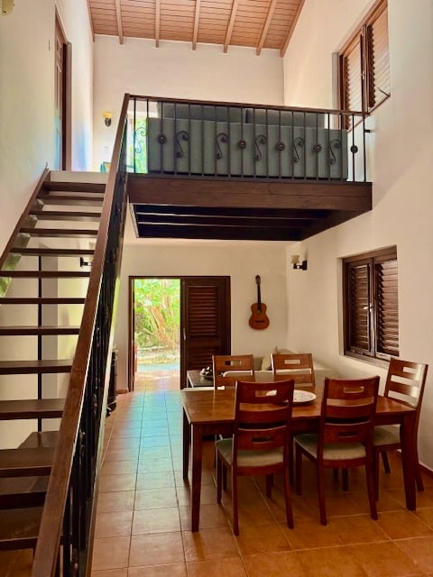 Pour les amateurs de détente et de plaisir caribéen, nous présentons ce duplex avec une chambre double en suite à l'étage (climatisation + ventilateur), une terrasse ensoleillée avec une vue impressionnante sur la mer est idéale. Rez-de-chaussée : canapé convertible simple dans le séjour avec salle de bains et cuisine équipée (pas de climatisation, seulement un ventilateur). Ainsi qu'un balcon donnant sur la mer. Piscine commune avec chaises longues. Accès direct à la mer pour une baignade dans une eau cristalline. Vous adorerez notre maison et notre île.