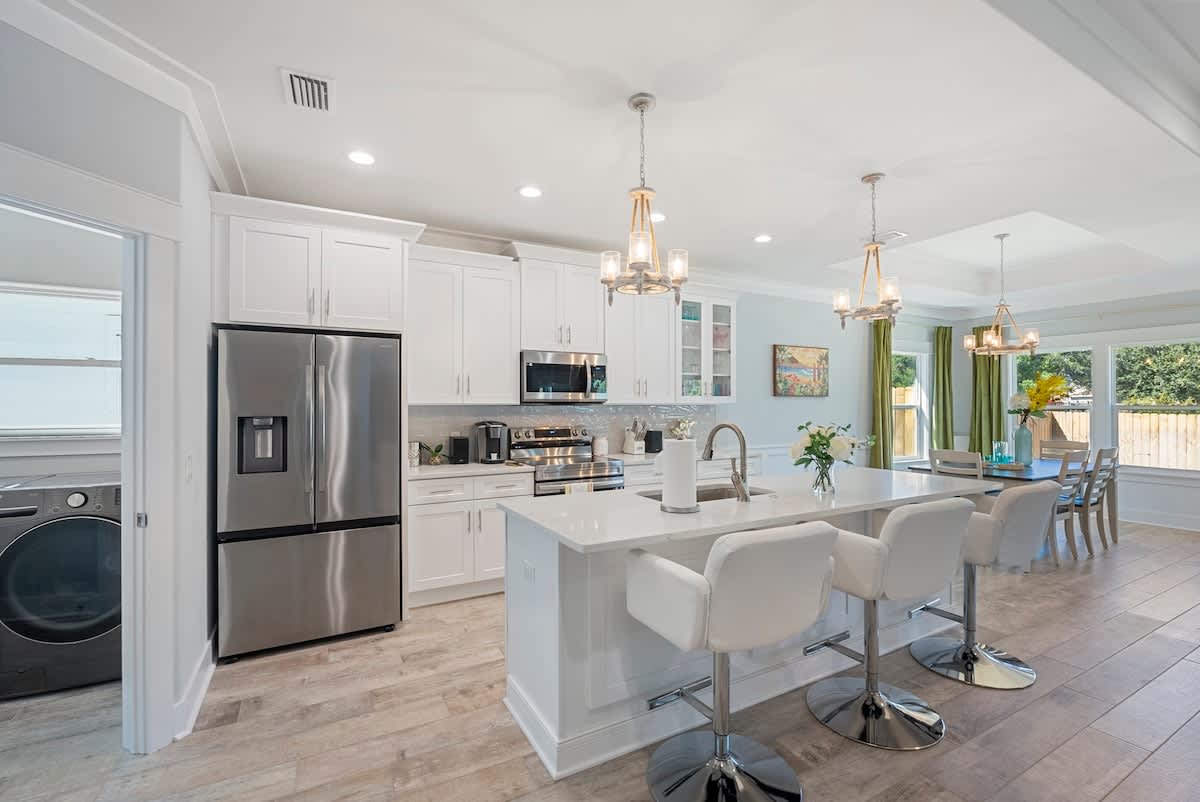 Palms by the Beach a une atmosphère chaleureuse luxueuse avec piscine, douche extérieure, cour privée, à 7 minutes à pied/3 minutes en voiture de la plage. Idéal pour une famille ou une escapade entre amis ! Emplacement parfait ! À moins de 10 minutes en voiture du parc Pier, à 8 minutes de Rosemary Beach et 30A. Destin est également à quelques minutes en voiture ! Sentez-vous comme chez vous avec une cuisine entièrement équipée. Chambres confortables et espace extérieur avec coin repas et barbecue. 2 tricycles adultes et 3 scooters pour enfants inclus ! Chariot de golf 4 places disponible à la location 85 $ par jour !