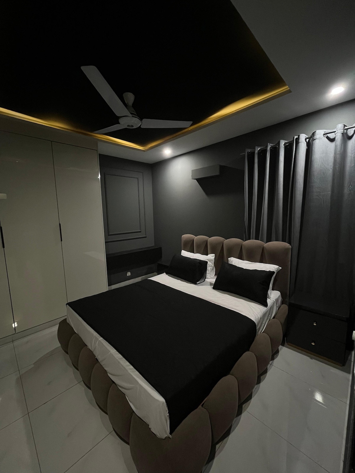 Our 1 BR condo in DHA Phase 5 is where urban chic meets celestial cool. Think: a glowing moon wall for those late-night selfies and a bold dollar-stacked art piece that screams "main character energy" Wake up to park views from your private balcony swing, binge your faves on the 50" 4K Smart TV, or cook up something aesthetic in the fully loaded designer kitchen. The interiors? Abstract, stylish, and made for the feed. Plus, you're right next to Lahore's hottest dining spots.