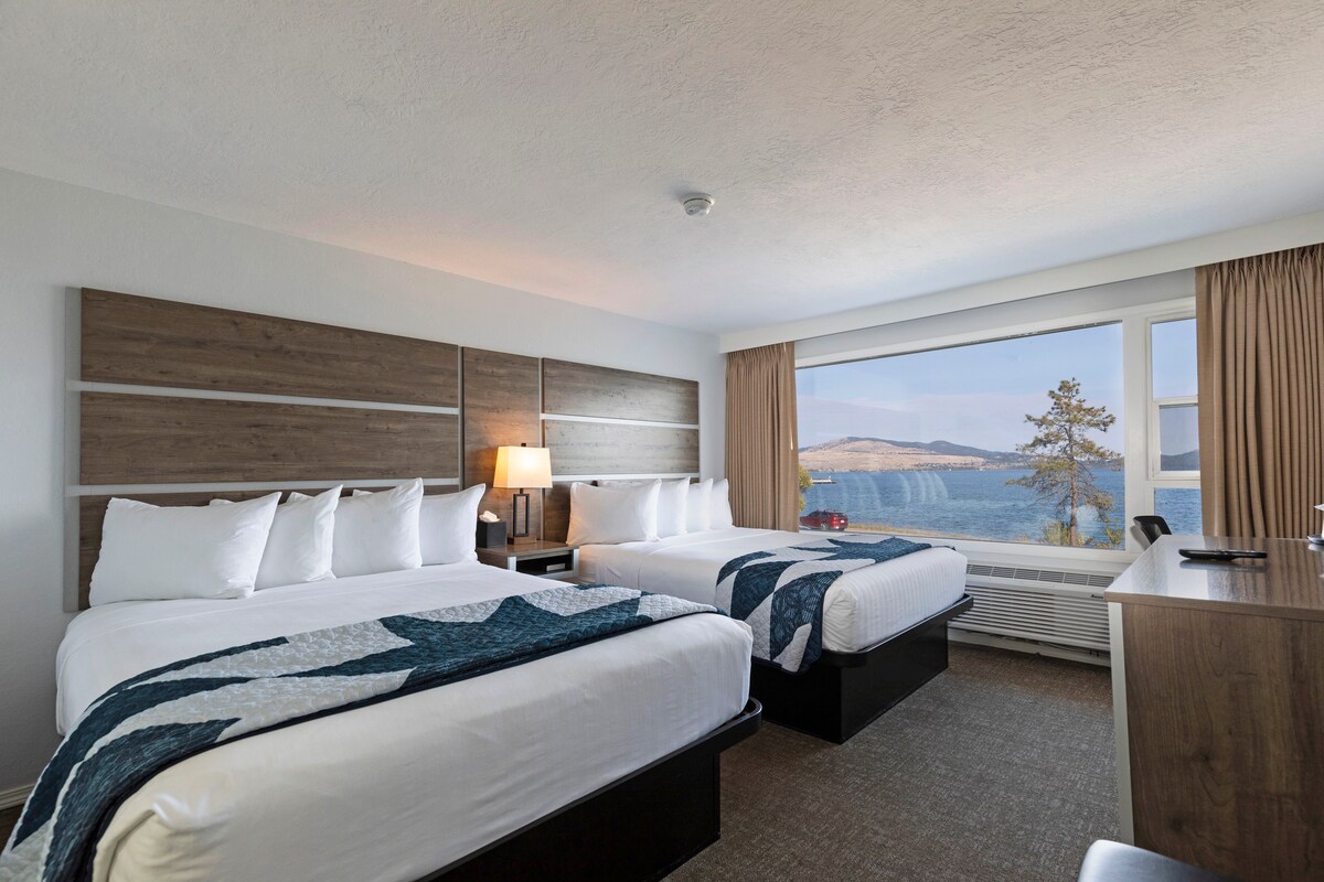 Our premium family room! This stunning 360 sq ft second-floor room offers the best views on the property with two queen beds and floor-to-ceiling windows overlooking Flathead Lake. Perfect for families or friends who want extra space and spectacular scenery.