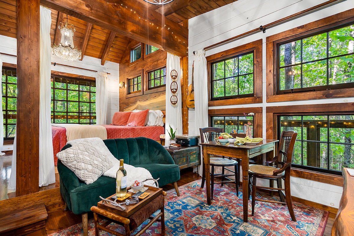 Cabane au sommet des arbres avec foyer et ruisseau de montagne