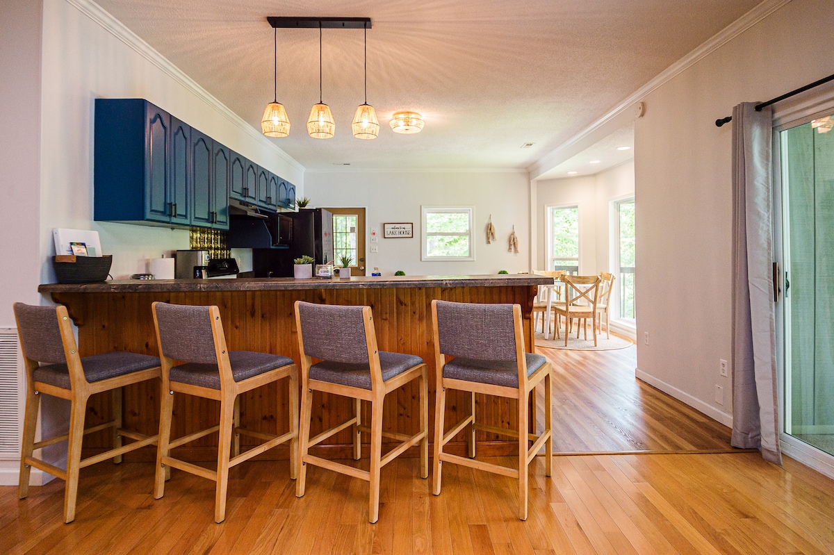 Rassemblez votre famille ou vos amis pour une escapade inoubliable au bord d'un lac au bord d'un lac dans un cadre ultra privé. Votre groupe passera un excellent moment sur le quai en utilisant des kayaks et des paddleboards fournis, de la pêche, de la natation et plus encore. Apportez ou louez un bateau. Détendez-vous sur le porche avec moustiquaire au bord du lac et dans plusieurs lieux de rassemblement intérieur/extérieur. Les enfants et les adultes adoreront regarder des films et jouer au baby-foot dans la salle de jeu. Créez des souvenirs autour de votre choix : foyer en bord de plage ou en pierre.