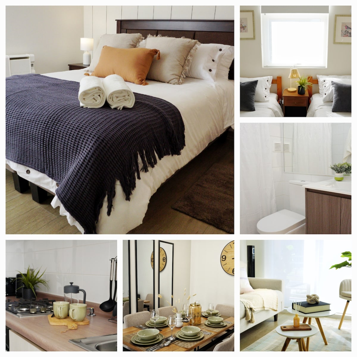 Appartement neuf et central à Puerto Varas, avec parking. Entièrement équipé pour 4 personnes, il dispose de 2 chambres (1 double et 1 double) et 2 salles de bains. Télévision et WIFI disponibles. Le bâtiment dispose d'une buanderie, salle de gym, quinze et salle de réunion. New centrally located apartment with parking. It's equiped for 4 people, it has 2 bedrooms and two bathrooms. It has cable TV and WI-FI. There're a laundry room, gym, BBQ area and a meeting room available.
