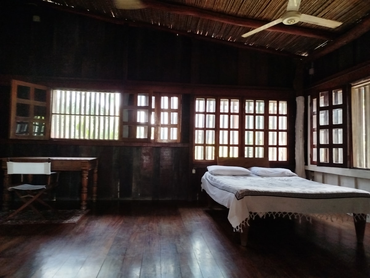 Levers de soleil sereins sur la plage et couchers de soleil tranquilles magiques sur Ometepe ! Bungalow privé avec WiFi, chambre propre et salle de bain avec douches d'eau chaude ! Patio avec hamac, table, sièges - jardins - propriété en bord de mer = plus longue étendue de plage de sable entre 2 volcans sur la route principale pavée. Belle porte et belles fenêtres en bois sculpté/verre - toutes grillagées avec protection en barre de métal et ventilateur au plafond. Plafond et meubles en bois naturel avec 1 lit double et 1 lit simple. Carrelage en céramique. Parking/Ménage quotidien ! Repas/blanchisserie en supplément. Visites