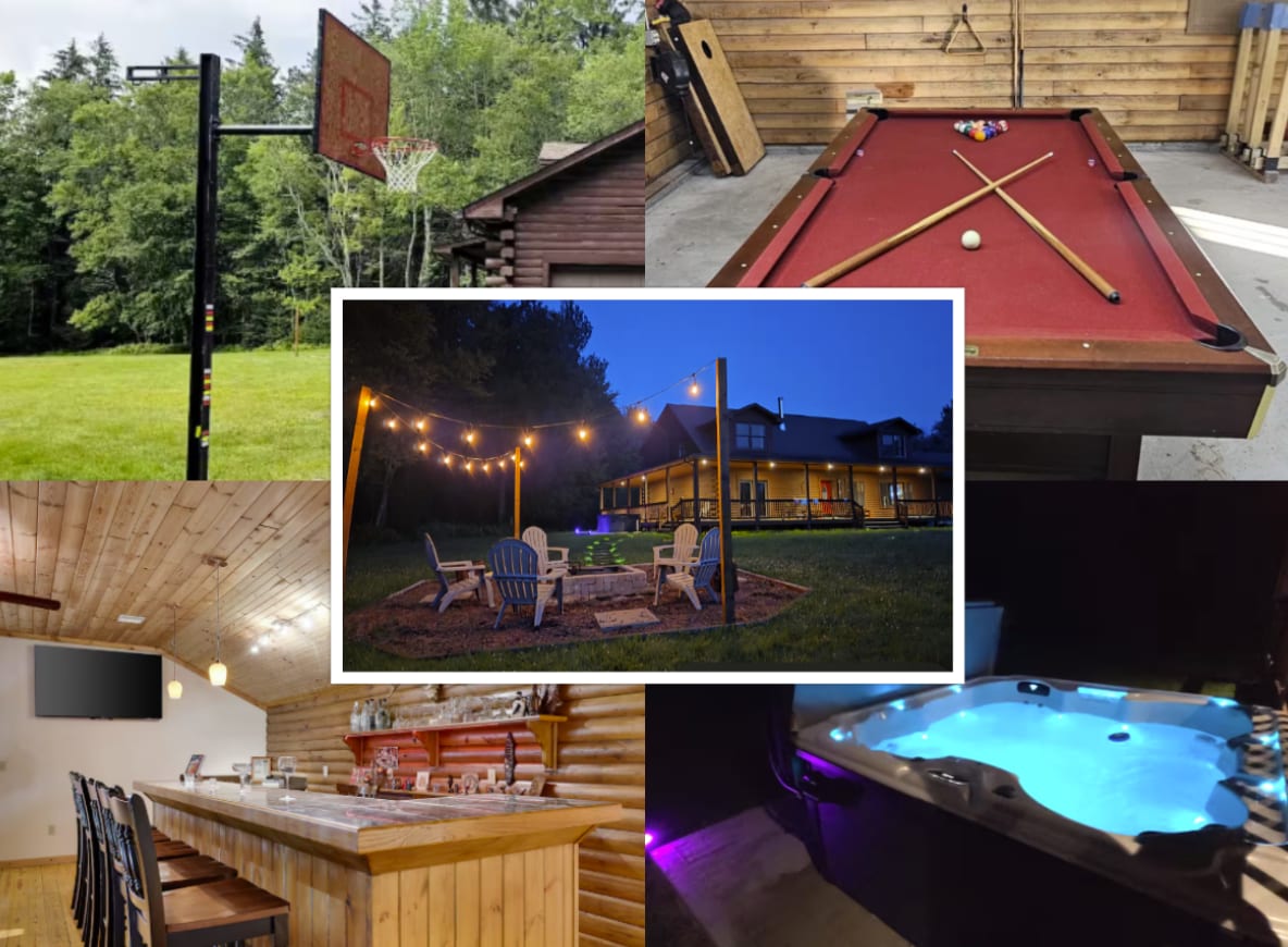 Chalet moderne toutes saisons sur terrain privé. Bénéficie de plafonds voûtés, de puits de lumière et d'accents rustiques. Salles de jeux adjacentes, salle de sport, chargeur de véhicule électrique de niveau 2, 2 terrasses, foyer, espaces de rassemblement, cheminée, espace de travail. Le lac Big Bass, rempli d'équipements, offre un accès à la piscine, aux lacs et plus encore. Chargé pour le confort : matelas/oreillers confortables, cuisine bien équipée, grandes télévisions 4K Roku partout, Playstation 4, billard, baby-foot, air hockey, arcades, gril Weber, climatisation/chauffage central. Beaucoup d'espace pour les groupes grands et petits, animaux acceptés !