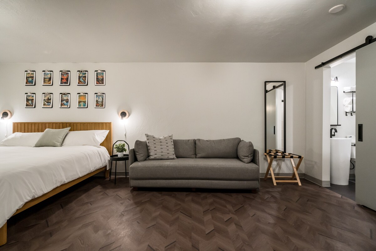 Notre plus grande chambre au 2e étage. Marchez seulement 0,4 miles jusqu'au Hult Center, 0,5 miles jusqu'au 5th Street Market, et quelques minutes jusqu'au centre-ville d'Eugene pour les restaurants et les événements. Stationnement gratuit sur place et accès facile au stade Autzen et au campus de l'UO. Cette chambre boutique moderne dispose d'un très grand lit, d'une télévision intelligente de 55 po avec diffusion en continu, d'une douche privée carrelée, d'un mini-réfrigérateur/congélateur, d'une station de café, d'un poste de travail pour ordinateur portable et d'une connexion Wi-Fi haut débit. Tout nouveau! Matelas moelleux, draps doux. Table à manger 4 places assises. Dépanneur sur place