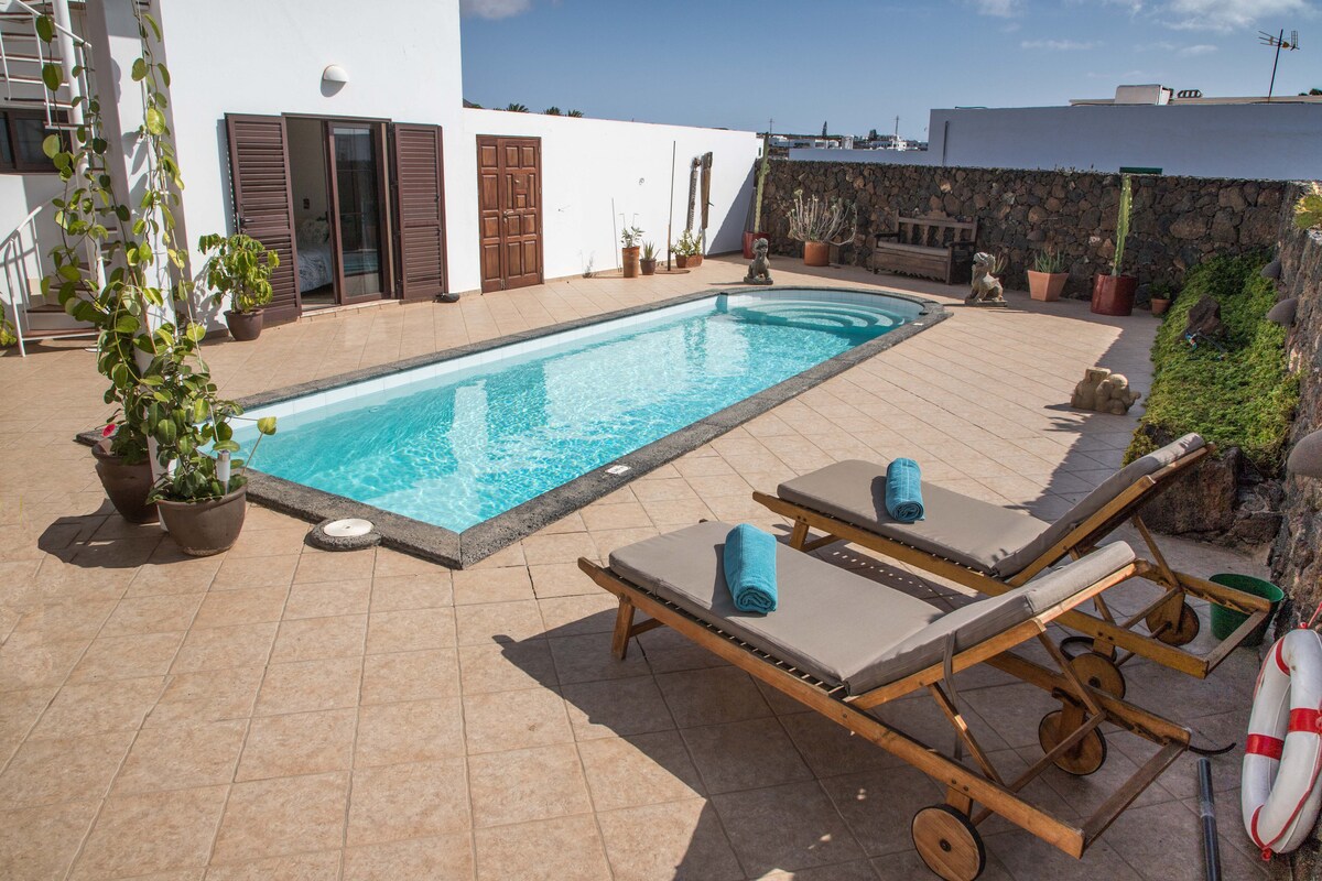 L'appartement spacieux et récemment rénové avec entrée privée est situé sur la colline dans un petit village Las Brenas loin des touristes et de la vie nocturne dans un quartier très sûr, à 15 min en voiture des plages dorées de Papagayo. La piscine d'eau salée de 10 m sur le patio orienté sud offre une vue imprenable sur l'océan Atlantique ainsi que sur le volcan Timanfaya. Des couchers de soleil incroyables ! Il y a 3 chambres, 1 salle de bain avec une option pour ajouter un studio en dessous, avec entrée privée ainsi que salle de bain. Cuisine entièrement équipée.
