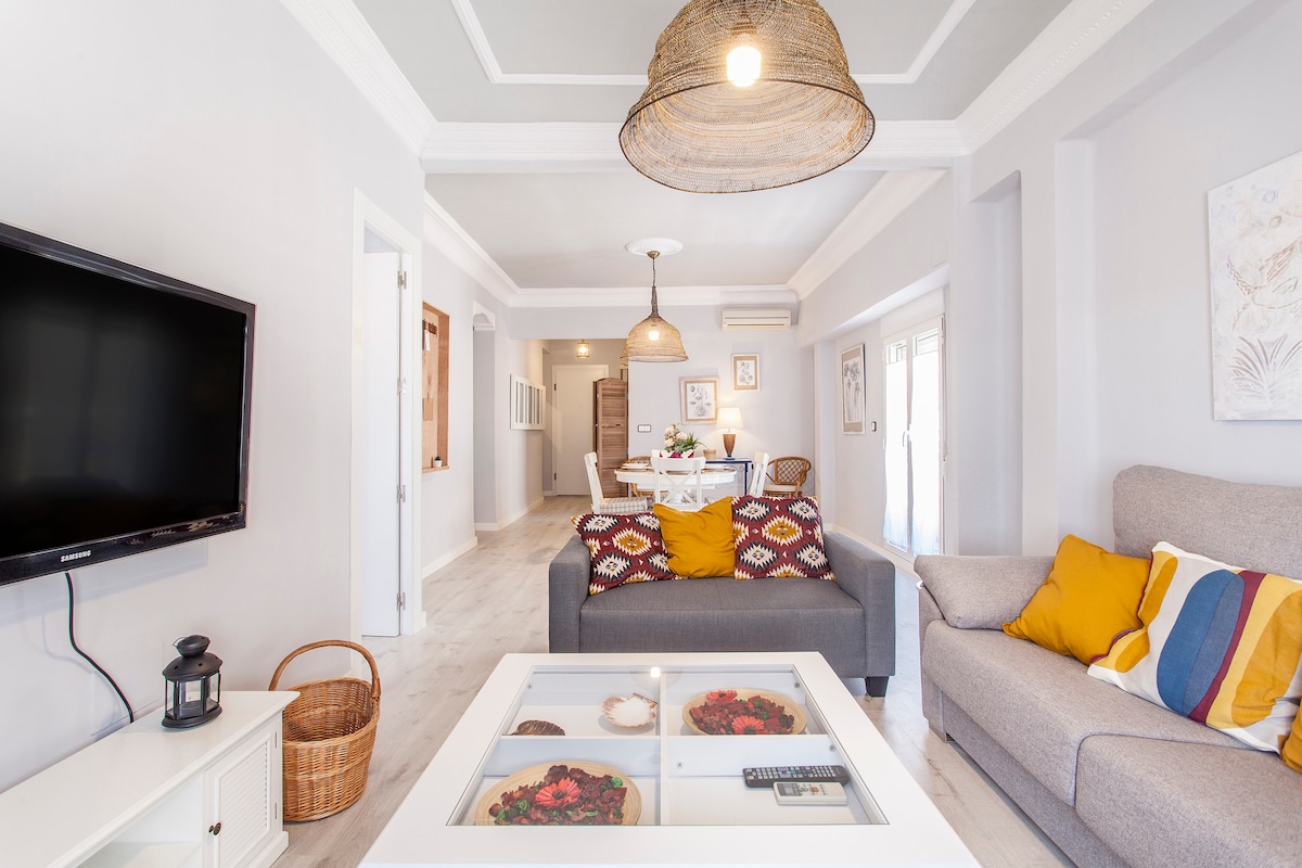 Appartement lumineux, frais et confortable de 3 chambres/2 salles de bains, situé sur la plage, dans le quartier d'El Cabanyal, à 3 min (200 mètres) à pied de la plage et des restaurants locaux. Situé à 3 min à pied de la station de métro Mediterrani ou à 5 min. Arrêt de métro Marina Reial Joan Carles I (15 min de trajet jusqu'à la vieille ville). Idéal pour les voyages d'affaires, qui veulent profiter de la plage dans un appartement récemment rénové de style méditerranéen.