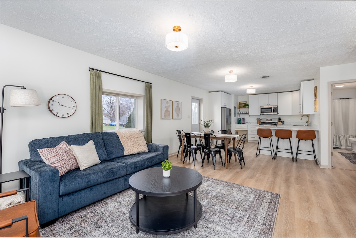 À votre arrivée, vous sentez que le calme est revenu. La lumière inonde l'espace, le rythme ralentit et la maison semble facile. Commencez la journée avec un café sur la terrasse pendant que votre chien explore la cour clôturée. Passez la journée à vous reposer ou à explorer les sentiers à proximité de Starved Rock. À la tombée de la nuit, rassemblez-vous autour du foyer ou détendez-vous sous les lumières tamisées de la terrasse. Hozho Cottage est un endroit calme et adapté aux animaux de compagnie pour arriver, se détendre et se sentir comme chez soi.