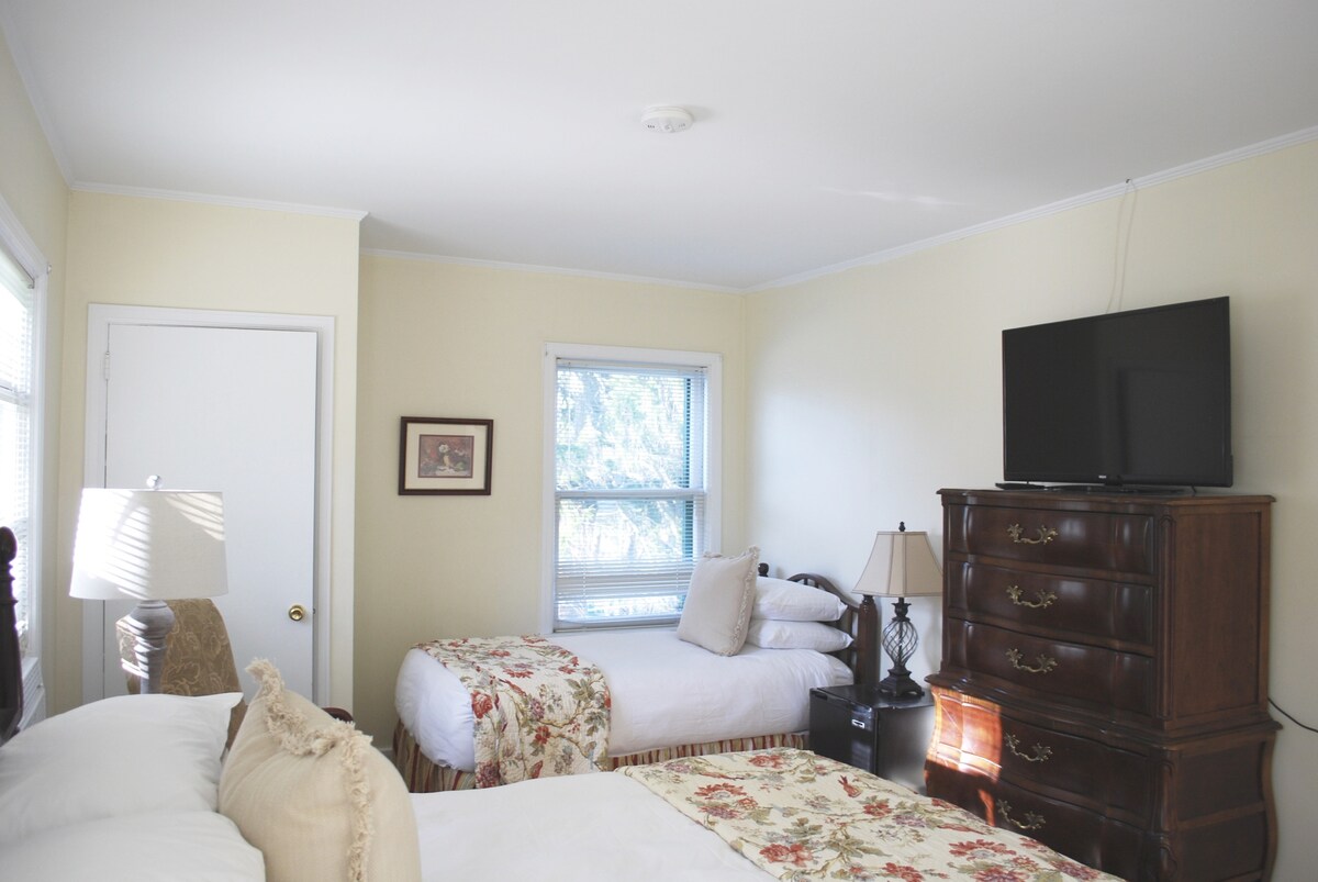 Your spacious rooms feature a fully stocked eat‑in kitchen, free WIFI, Netflix and leather chairs or sofas. Our private grounds feature an outdoor pool table, a bocce court, a swim spa, a fully equipped fitness room and a charming courtyard with a cozy fire pit. Steps away are excellent restaurants, fast‑food, a supermarket and convenience stores. The Track is ¾ mile away, SPAC one mile away, and Downtown is a ¼‑mile stroll - a free shuttle to both the Track and Downtown.Maid service included.