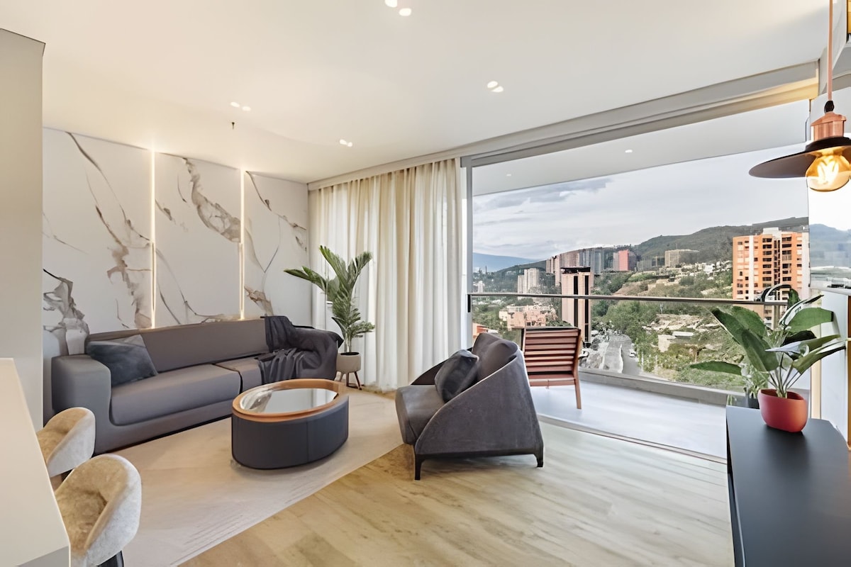 Moderno apartamento con vistas panoramicas y detalles arquitectónicos exquisitos, ubicado en El Poblado. Cuenta con 3 habitaciones, 1 cama King y 2 Queen size. Cada habitación cuenta con baño privado y vestir. Una hermosa sala y cocina, y un área privada de trabajo. A poco minutos de las principales zonas de entretenimiento, gastronimia y los mejores centros comerciales. Provenza, Parque Lleras, Parque del Poblado, Manila, Mall El Tesoro, Mall Santafé y el Mall Oviedo.
