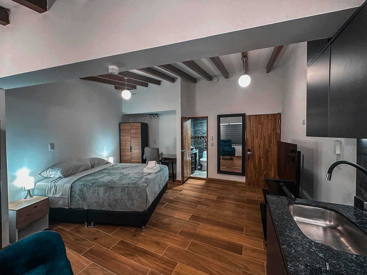 Loft 43 Medellin Increible apartaestudio Ideal para quienes disfrutan trabajar desde cualquier lugar. Cuenta con una cama Queen Size, escritorio y silla de trabajo, cocina integral dotada, baño privado con ducha de agua caliente, televisión de 43 y conexión WIFI. Los elementos básicos de cocina puedes solicitarlos en recepción, Aceite, vinagre Sal y pimienta puedes comprarlo en en una tienda cercana. Para registrarse es necesario presentar un documento de identificación fisico válido.