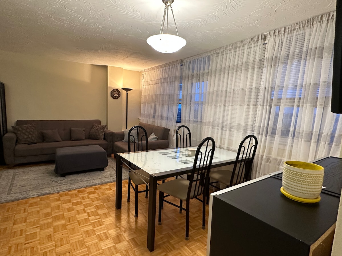 Studio confortable, lumineux et meublé au sous-sol avec de hauts plafonds et une entrée privée, idéal pour les visiteurs de courte durée. Ce logement comprend une petite cuisine, une laveuse et une sécheuse dans la suite, une salle de bain complète, une télévision et l'Internet 5G de Bell. Netflix et Prime disponibles. Excellent emplacement : à 10 minutes de l'autoroute 401, des épiceries, des restaurants et un accès facile au centre-ville, à l'aéroport Pearson et au centre de congrès de Toronto et à une courte distance en voiture du stade Rogers. Logement calme, sans fumée, sans animaux. Sheppard et Bathurst