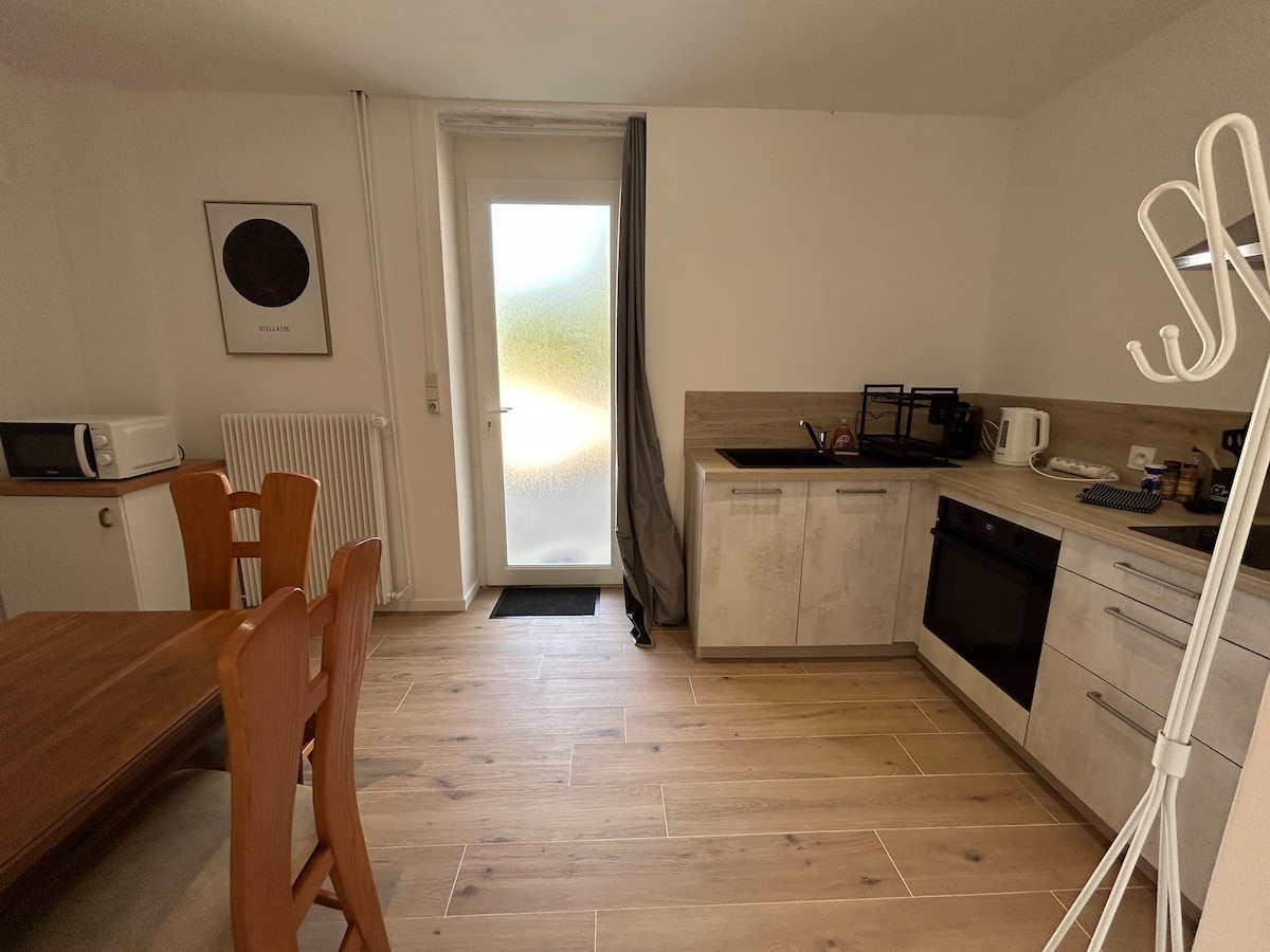 Appartement T2 à l'étage d'une maison. Situé dans un petit village des Dombes en face d'un restaurant. Pièce principale avec une cuisine complètement équipé (lave vaisselle, four, frigo, plaque gaz, micro onde, ...) un coin salon tv avec canapé. Une salle de bain avec une grande douche 120x80cm équipé d'une machine à laver. Une grande chambre avec un lit double et rangements. Chauffage et clim réversible. Terrasse avec mobilier.. Parking.