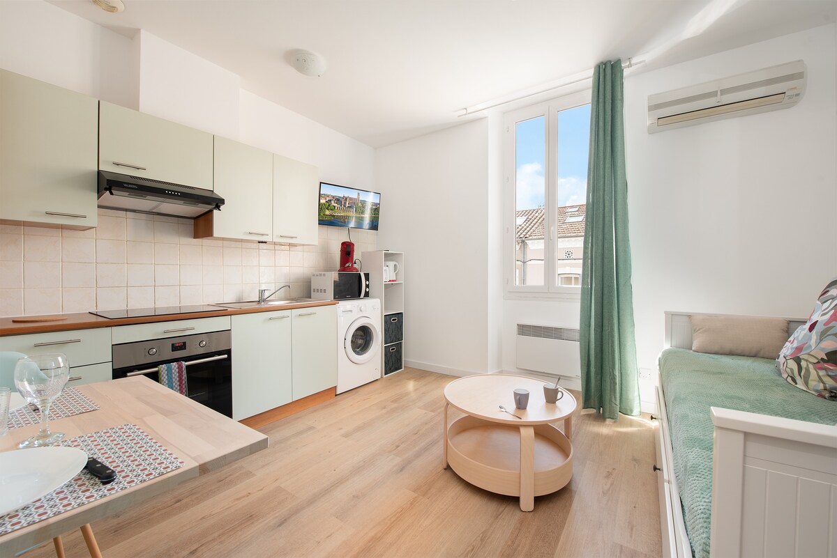 Coquet T2 climatisé situé à 5 minutes à pied du cœur de la cité Épiscopale d'Albi. Vous logerez dans un appartement résidentiel composé de : - une grande chambre avec un lit en 140/190, un double placard penderie (suffisamment d'espace pour un lit bébé mais non fourni) - une kitchenette équipée: plaques de cuisson, petit frigo, micro-ondes, cafetière, - un salon avec clic-clac et télévision, - une salle de bain et un WC séparé (serviettes de toilettes non fournies), - pas de WIFI désolé :)