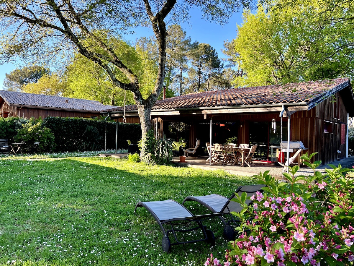 Belle Villa de 140 m2, jardin de 5000 m2 comprenant une Piscine avec abri amovible sécurisé, une grande terrasse bois et de grands chênes fournissant une ombre agréable en été. La maison est située au calme, en pleine nature, la petite route de riverain qui borde le terrain est très peu passante. Au-delà de la nature environnante, vous pourrez profiter des plages de l'Océan ou du Bassin d'Arcachon situées à 25 min en voiture, ou encore de la ville de Bordeaux ou du vignoble du Médoc à 30 min