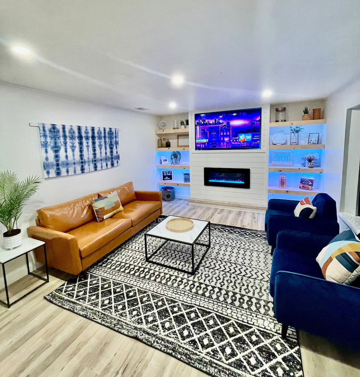 Le tout nouveau revêtement de sol de la maison moderne de style Santa Fe est spacieux et dispose d'un espace extérieur incroyable avec un spa, un barbecue et des meubles de patio pour se détendre. Il y a aussi une terrasse sur le toit avec une vue imprenable et à couper le souffle. L'intérieur spacieux de deux étages comprend trois grandes chambres et trois salles de bain. Les voyageurs ont accès à un garage pour deux voitures, à une laveuse/sécheuse, à un réseau Wi-Fi et à une télévision avec des services de diffusion en continu sur demande. Un parking en bateau est disponible sur le côté de la propriété et hors de la rue (60 pieds x 11 pieds).