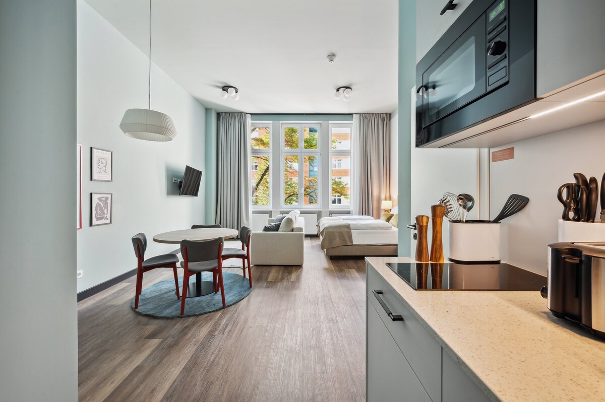 Bienvenue dans notre studio moderne, parfaitement situé entre Gleisdreieck Park et Potsdamer Straße. La cuisine entièrement équipée, un lit spacieux de 180x220 cm, un chauffage par le sol et une salle de bain moderne avec douche à effet pluie fournissent tout ce dont vous avez besoin pour un séjour confortable. Détendez-vous sur la loggia ensoleillée et profitez de la tranquillité. Emplacement privilégié avec d'excellentes liaisons de transport. Cafés, restaurants et marchés sont à quelques pas, parfaits pour explorer Berlin !
