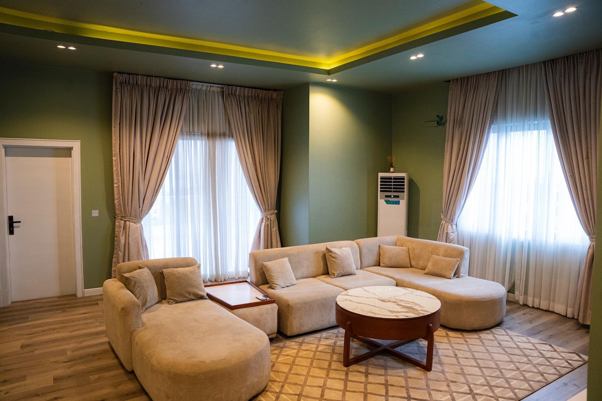 Bienvenue dans votre maison loin de chez vous où nous offrons l'électricité 24 heures sur 24 et la climatisation de votre appartement. Il s'agit d'un appartement de 2 chambres savoureux, accueillant et familial avec un balcon. Il se trouve dans un domaine à accès public restreint. C'est l'endroit idéal pour des vacances en famille et une escapade de fin de semaine, des enterrements de vie de jeune fille, une demande en mariage, etc. Voici ce que nous avons : Électricité 24 heures sur 24 Climatisation 24 h/24 Eau chaude 24h/24 Eau propre traitée Services Internet via Starlink Wi-Fi Errand services