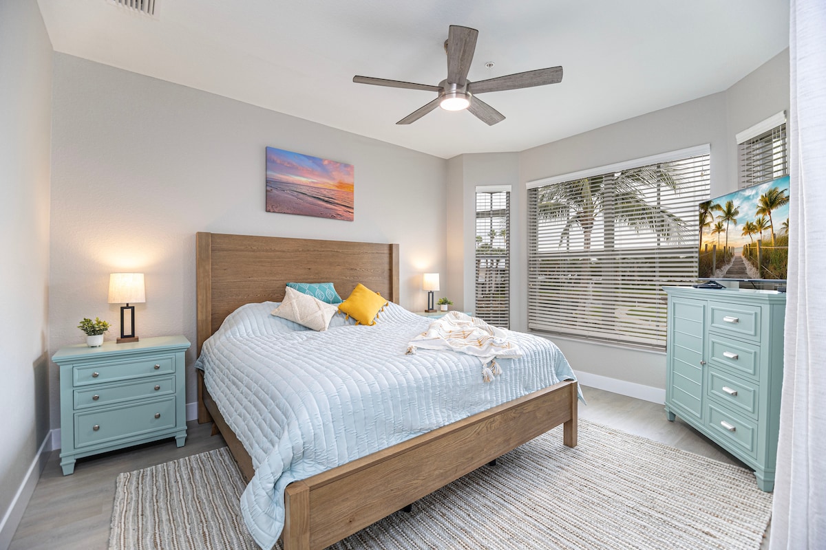 Profitez d'un style de vie de villégiature dans ce condo lumineux de 2 chambres à coucher et 2 salles de bain avec Wi-Fi, un espace de travail dédié et une cuisine entièrement équipée. Sirotez un café sur le lanai surplombant la fontaine, puis promenez-vous à quelques pas de la piscine, du spa, des courts de tennis, de la salle de sport ou des barbecues. Idéalement situé à Lely, parfait pour se détendre et à quelques minutes de Naples, de Marco Island, des plages les mieux notées, des magasins et des restaurants. BONUS : golf gratuit du 15 mai au 15 octobre pour les séjours de 3 nuits et plus. Demandez plus de détails.