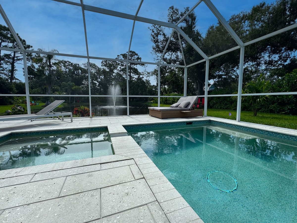 *PISCINE CHAUFFÉE* Bienvenue dans votre oasis tropicale à Englewood en Floride! Sortez et préparez-vous à vous laisser émerveiller par le magnifique espace extérieur. La piscine chauffée par panneaux solaires vous invite à vous rafraîchir pendant les chaudes journées de Floride. Imaginez siroter votre boisson préférée alors que le ciel se transforme en une toile de couleurs vives chaque soir. Pour les amateurs de pêche, un quai privé vous attend. Faites votre queue et profitez de la sérénité du lac, le tout dans le confort de votre jardin.