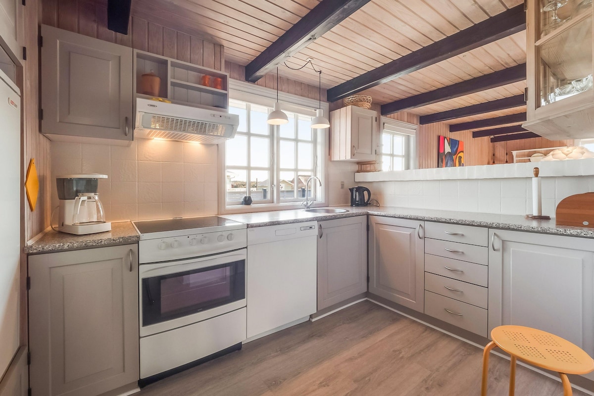 Détendez-vous en famille dans cet endroit paisible entièrement clôturé à seulement 200 m de la mer. Cette maison de vacances de 145 m2 est un choix évident. La maison est meublée avec 6 places de couchage dans trois chambres doubles, une cuisine spacieuse, deux salons - tous deux avec coin repas, deux salles de bains et un WC, un beau jardin avec un spa. Cette maison est bien isolée, avec des fenêtres en verre à trois couches, une pompe à chaleur, un chargeur pour véhicule électrique. Belle vue sur le phare de Bovbjerg. Consommation incluse, par exemple, chargeur pour VE.