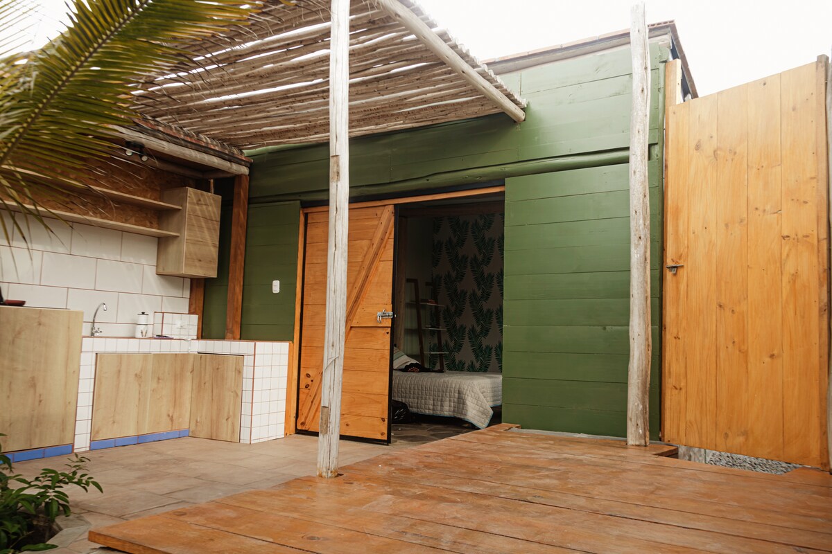 Détendez-vous et installez-vous dans cet espace rural. Le bungalow est un espace spacieux et lumineux avec un look chaleureux où vous pourrez vous détendre près de la plage. En entrant dans le bungalow, vous disposez d'une terrasse privée avec une kitchenette ouverte et d'une terrasse en bois avec des meubles pour bronzer et profiter de l'extérieur. Les installations intérieures disposent d'une grande chambre avec un lit Queen Size, un canapé, une table à manger et des fenêtres qui s'ouvrent sur un patio intérieur.