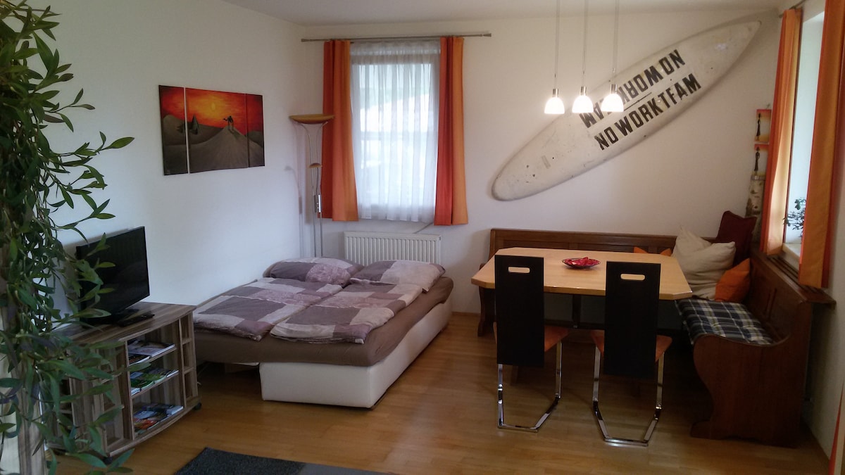 Je loue mon appartement au premier étage de notre maison près du centre de Velden (5 min. Temps de marche jusqu'au lac et dans le village). Vous avez tout l'étage pour vous tout seul. La cuisine est entièrement équipée et fournie avec des bases de cuisine telles que du café bio, du thé, des pâtes, de la sauce, de l'huile et des épices.