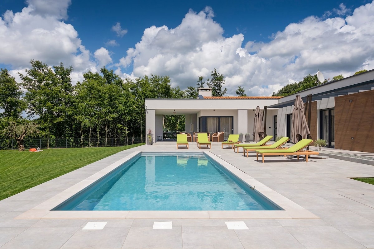 Une maison de vacances au cœur de l'Istrie vous offrant une piscine privée chauffée avec jacuzzi et jacuzzi intérieur et sauna! Entouré d'une nature paisible avec vue sur un lac, des vignobles et des oliveraies. Deux chambres avec des lits de 1,8 m de large et des lits d'appoint pliants. Salon avec canapé convertible. Piscine chauffée avec massage à l'eau et à l'air. Salle de bien-être avec bain à remous (4 personnes) et sauna infrarouge (3 personnes). Sortie vers l'espace privé pour bronzer (vêtements facultatifs). Stationnement pour 2 véhicules avec chargeur pour VE.