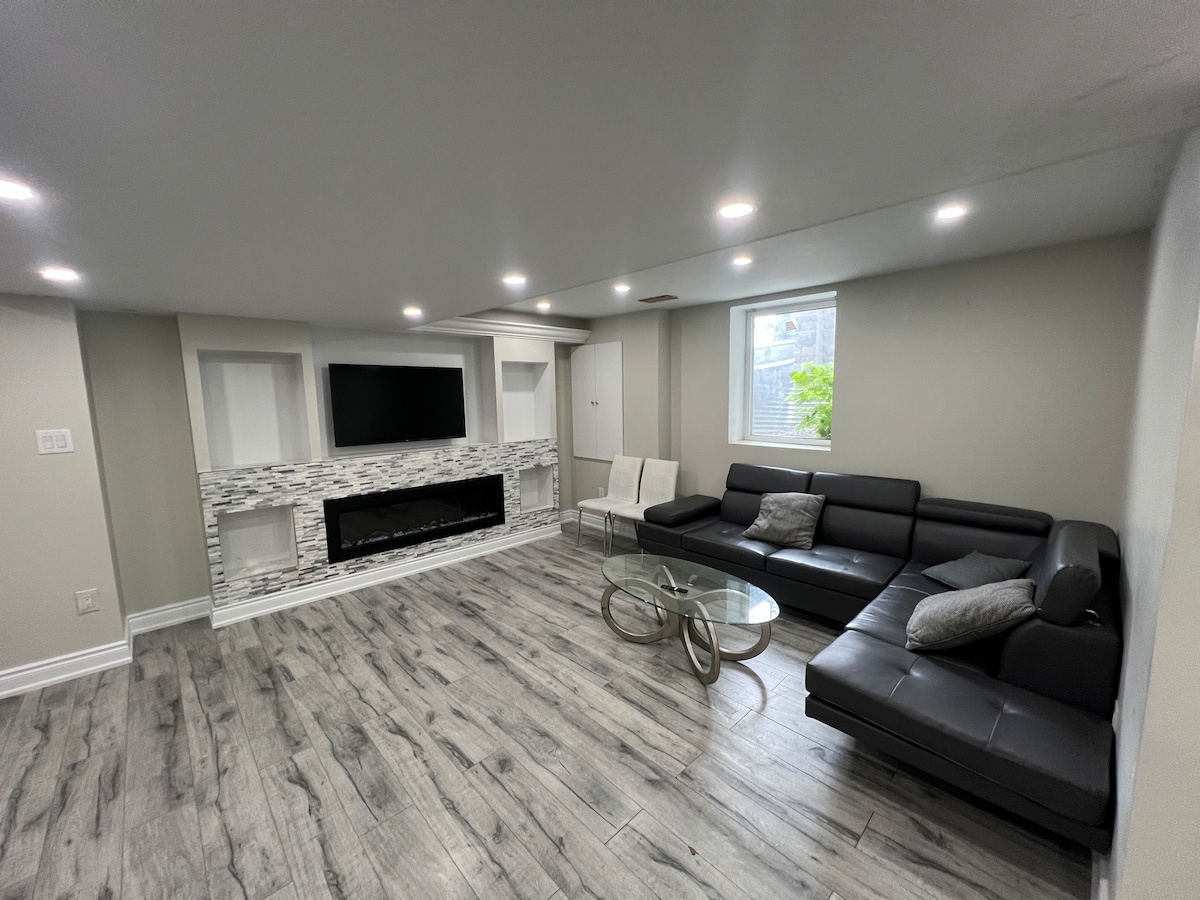 Profitez d'un élégant appartement au sous-sol d'une chambre avec entrée privée, parfait pour un séjour confortable et relaxant. Les caractéristiques comprennent une cuisine complète, une salle de bain moderne avec une douche à effet pluie luxueuse, une connexion Wi-Fi gratuite et un salon lumineux avec de grandes fenêtres et 2 téléviseurs. Sortez dans votre coin salon privé et profitez du stationnement gratuit à quelques pas de votre porte. Avec son design moderne et ses petites attentions, cette retraite allie confort et commodité.